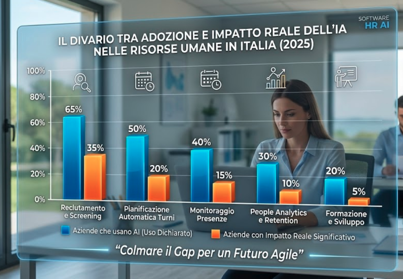 Questi dati raccontano due realtà coesistenti: c’è una forte spinta verso l’AI in HR, e allo stesso tempo un gap di maturità operativa significativo. Le aziende che stanno già investendo in modo strutturato — non solo acquistando licenze, ma riprogettando processi — stanno costruendo un vantaggio competitivo difficile da colmare per chi aspetta.