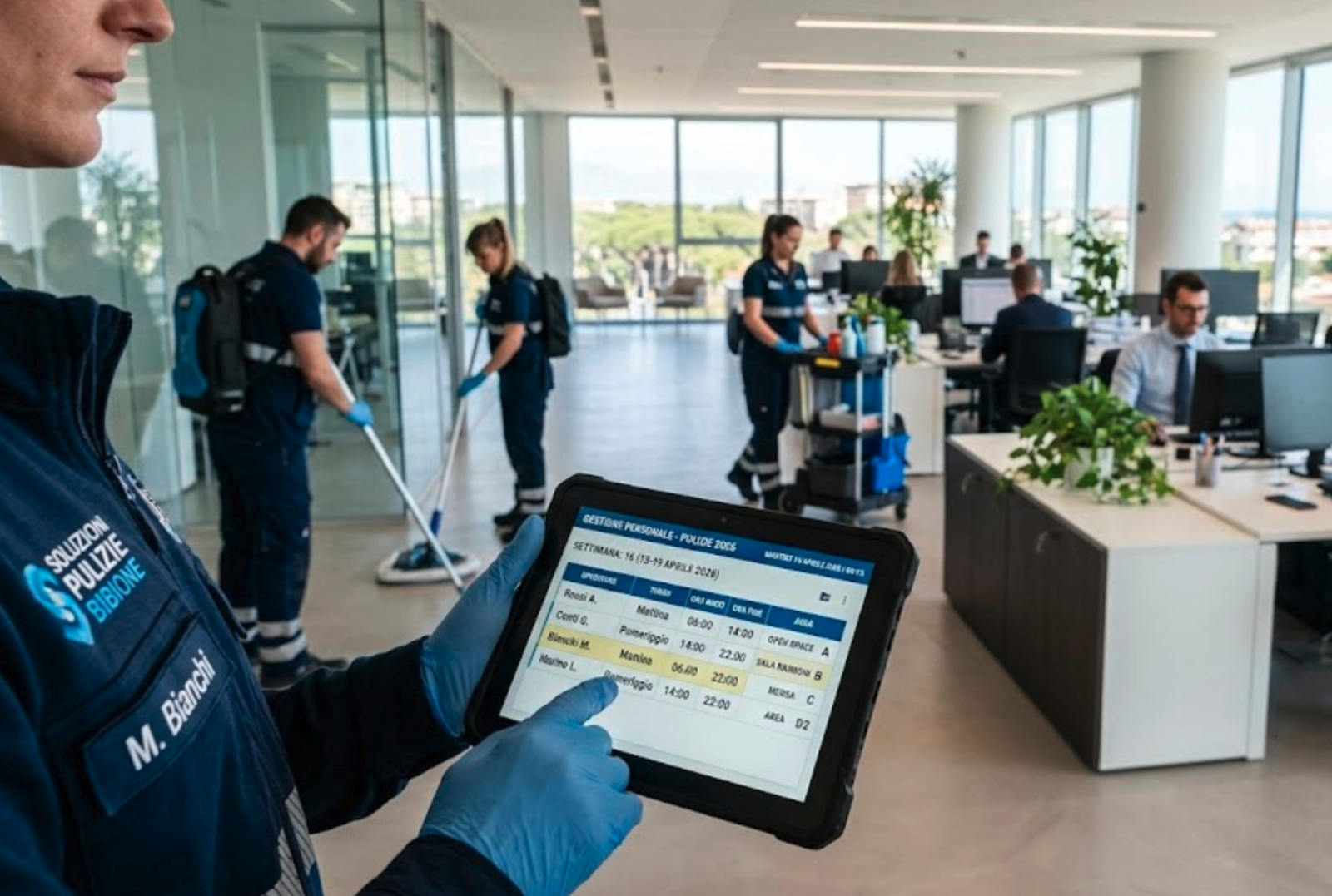 Quali sono le principali tendenze del settore pulizie professionali nel 2026? Le 10 tendenze principali del cleaning professionale nel 2026 sono: performance misurabili e accountability, disinfezione mirata, turni ibridi con portieri diurni, green cleaning, controllo qualità dell’aria interna, cura professionale dei pavimenti, stabilità e cross-training del personale, automazione con attrezzature smart, piani personalizzati per tipologia di cliente e comunicazione rapida per la risoluzione dei problemi. Tutte convergono su un unico requisito operativo: una gestione del personale più precisa, documentabile e flessibile.