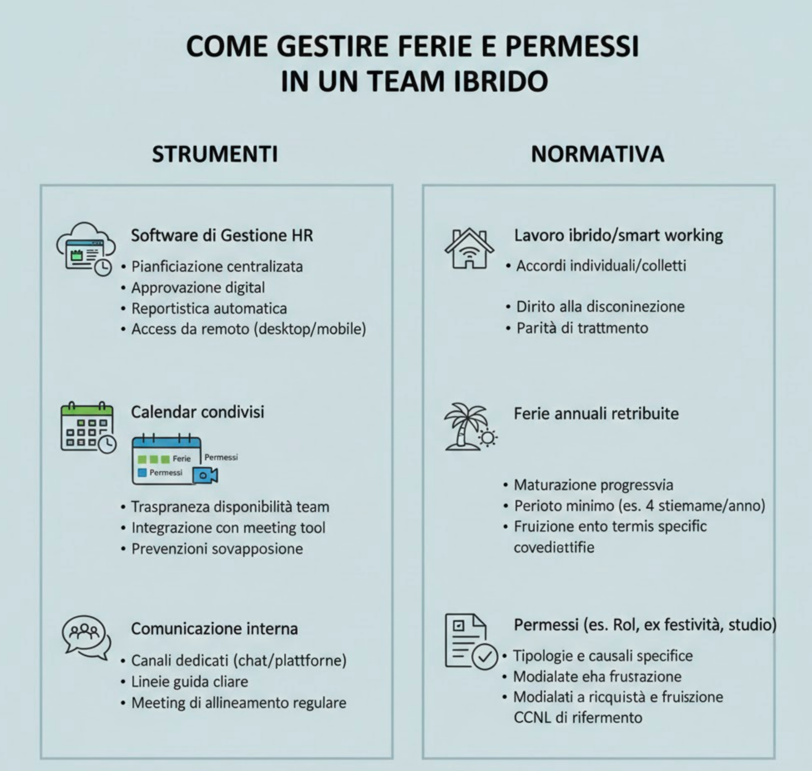 Un team ibrido non dorme mai completamente: c’è chi è in sede, chi da remoto, chi in un fuso orario diverso. Eppure le ferie devono essere pianificate, i permessi approvati, la continuità operativa garantita — e tutto in conformità con il CCNL. La gestione delle ferie e permessi in un team ibrido è diventata una delle sfide più concrete per gli HR manager italiani nel 2024-2025.