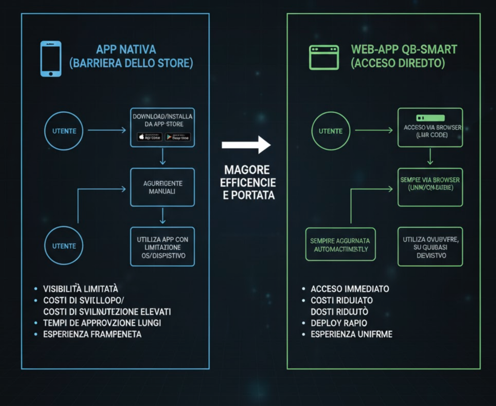 Essendo una Web-App (Progressive Web App), qb-smart-ai elimina i vincoli delle app tradizionali: